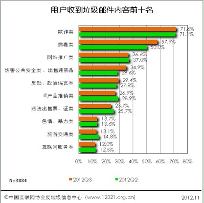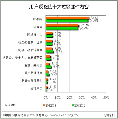 中國IDC評述網(wǎng)12月03日報道:12321網(wǎng)絡(luò)不良與垃圾信息舉報受理中心與中國互聯(lián)網(wǎng)協(xié)會反垃圾郵件信息中心聯(lián)合開展的中國反垃圾郵件狀況調(diào)查活動2012年第三季度調(diào)查顯示,2012年第三季度,"欺詐類"、"病毒類"和"網(wǎng)站推廣類"垃圾郵件是用戶郵箱中收到垃圾郵件的主要內(nèi)容。其中71.6%的被調(diào)查者收到過"欺詐類"的垃圾郵件,環(huán)比上漲0.5個百分點,居首位。居二、三位的是"病毒類"和"網(wǎng)站推廣類",比例分別為57.9%和36.6%。其中"病毒類"垃圾郵件上漲較多,上漲7.9個百分點。"網(wǎng)站推廣類"下降0.4個百分點。本季度漲幅最明顯的是"病毒類",第四位的"妨害公共安全類、出售違禁品"漲幅也達6.3個百分點,在本季度,"病毒類"和"妨害公共安全類、出售違禁品"的比例漲幅最多。